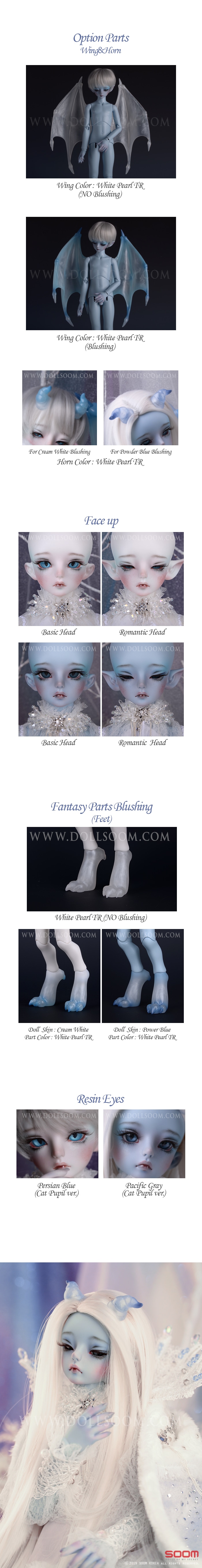 – 足パーツカラー(Feet Part Color)* : X(Human set) / Cream White or Powder Blue(ドールスキンカラーと同じ) / White Pearl TR
